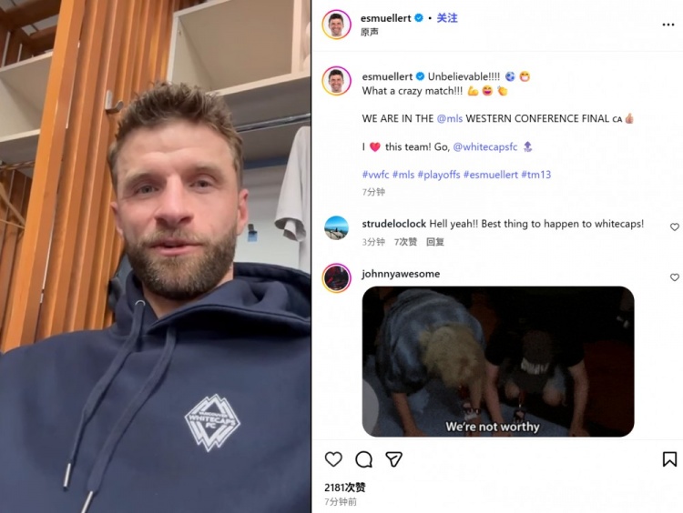 他也在赛后通过社媒纪念晋级:“难以置信!!!! ⚽️????多么疯狂的一场比赛!!! ????????????我们晋级西部决赛了????????我❤️这支球队!加油, @温哥华白浪????”